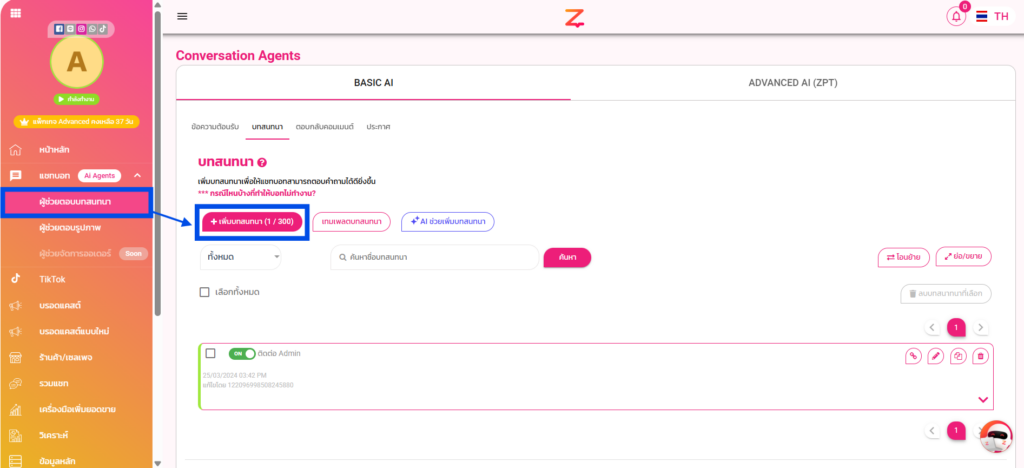 ขั้นตอนแรกไปที่ แชทบอท (ผู้ช่วยตอบบทสนทนา) > หัวข้อ BASIC AI > กด + เพิ่มบทสนทนา