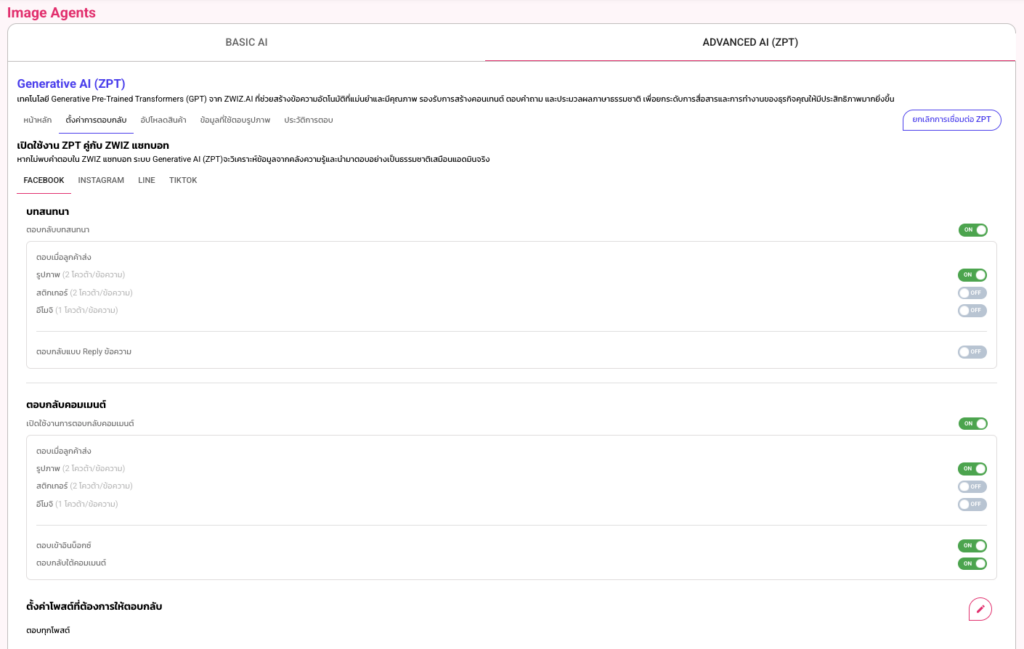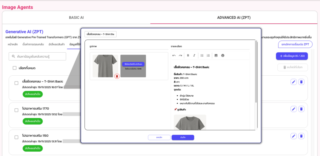 ระดับ Advance AI (ZPT) ของ Image Agents ถูกออกแบบมาเพื่อช่วยร้านค้าที่ต้องการให้ลูกค้าส่งรูปภาพเข้ามา แล้วให้ระบบวิเคราะห์และตอบกลับได้อย่างชาญฉลาดยิ่งขึ้น — ไม่ว่าจะเป็นรูปสินค้า อุปกรณ์ เสื้อผ้า เครื่องสำอาง หรือรูปอื่น ๆ ที่เกี่ยวข้องกับสินค้าในร้านของคุณ