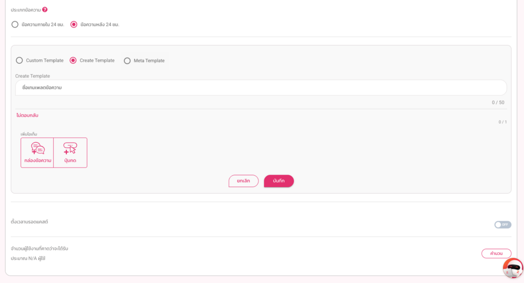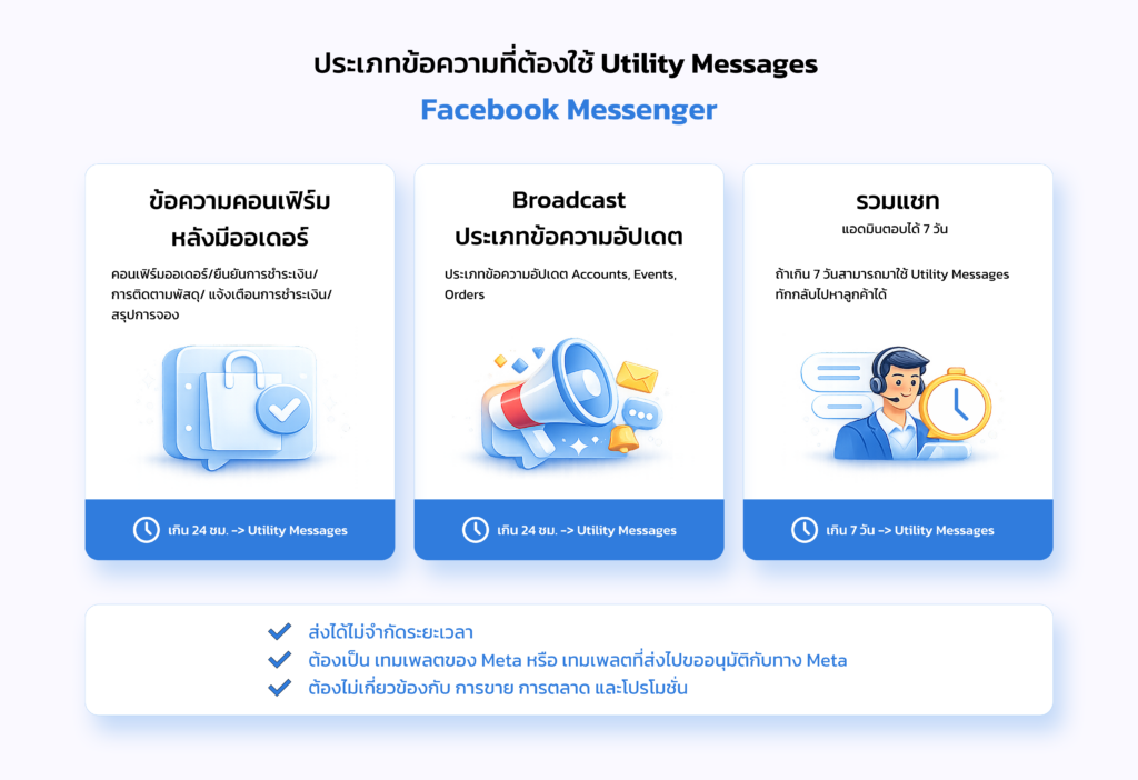 ช่วยให้คุณส่งข้อความหาลูกค้าได้ “เกิน 24 ชม. แบบไม่จำกัดเวลา” อย่างไรก็ตาม จะมีข้อกำหนดให้ ต้องส่งขออนุมัติเทมเพลตข้อความ (Utility Messages) กับทาง Meta ล่วงหน้า ก่อนการใช้งาน โดยเนื้อหาของเทมเพลตข้อความ (Utility Messages) จะต้องไม่มีเนื้อหาเกี่ยวข้องกับการตลาดและโปรโมชั่น