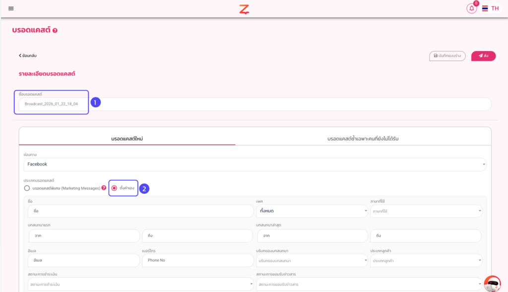2. ช่องทาง Facebook เลือกประเภทบรอดแคสต์แบบ ตั้งค่าเอง