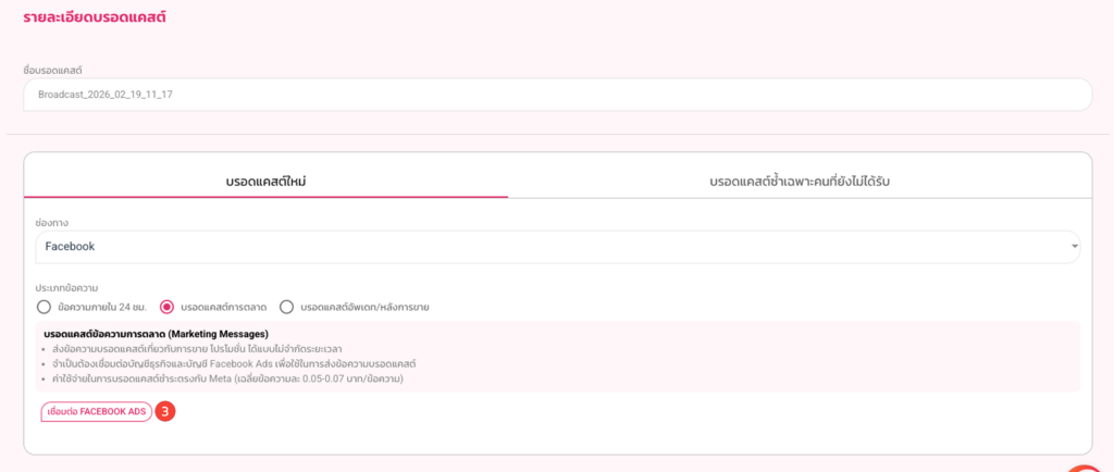 เมื่อเชื่อมสำเร็จแล้ว เมื่อต้องการส่งบรอดแคสต์ (Marketing Messages) วิธีการตั้งค่าข้อความมีดังนี้