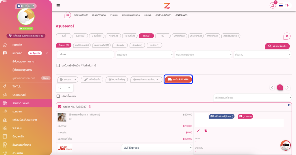 พอข้อมูลถูกส่งไปให้ Packhai หลังบ้านของ Packhai ก็จะมีออเดอร์นั่นขึ้นมาค่ะ (มีแจ้งใน “ช่องทาง” ด้วยค่ะ ว่าออเดอร์นี้มาจาก ZWIZ.AI)