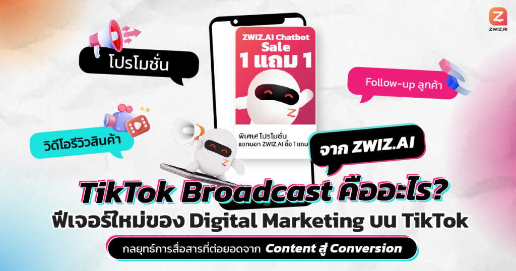 TikTok Broadcast คือ ฟีเจอร์ในระบบแชทบอท ZWIZ.AI ที่ช่วยให้ธุรกิจสามารถ ส่งข้อความหาลูกค้าบน TikTok ได้เชิงรุก (Proactive Communication) ภายใต้ข้อจำกัดของแพลตฟอร์มอย่างถูกต้องและเป็นธรรมชาติ
