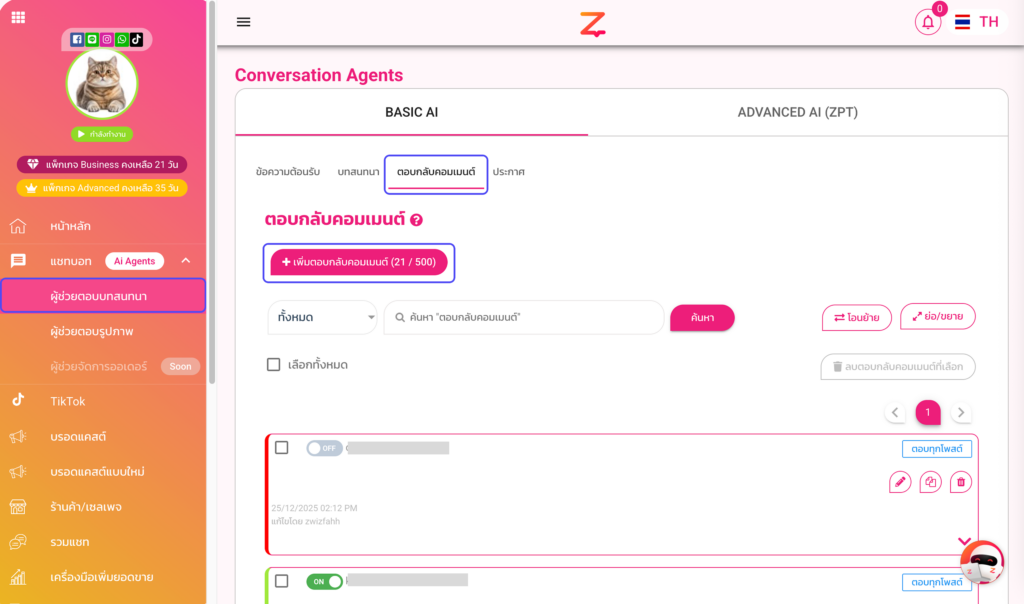 **ฟีเจอร์ TikTok Comment นี้ จะสามารถใช้ได้เฉพาะลูกค้า ZWIZ แพ็คเกจ Business เท่านั้นนะคะ