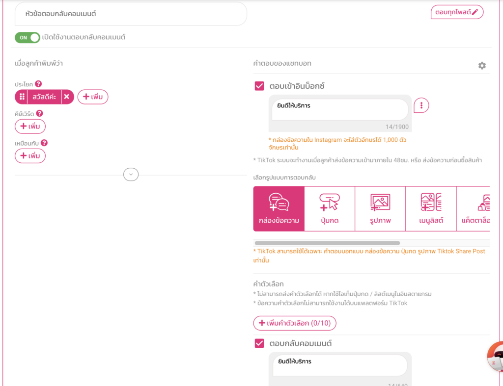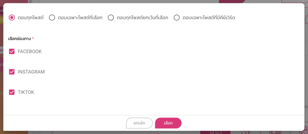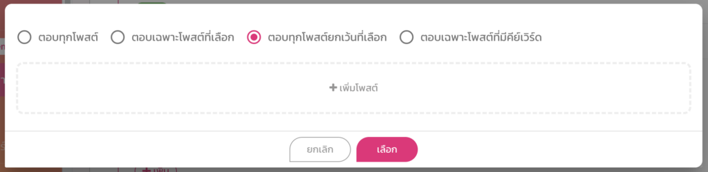 หากเลือกตอบทุกโพสจะเป็นการตอบทุกโพสต์ สามารถเลือกช่องทางได้ว่าจะตอบทุกโพสต์ของช่องทางไหนบ้าง