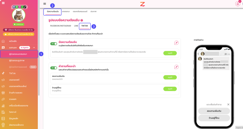 ในระบบ TikTok สามารถตั้งค่าได้ ทั้ง ข้อความต้อนรับลูกค้า (Welcome Message) และ คำถามที่แนะนำ (Suggested Questions) พร้อมกัน