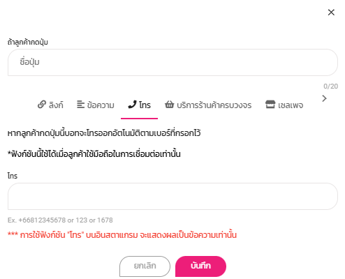 ฟังก์ชั่น “โทร” บน Instagram จะแสดงผลเป็นเบอร์โทรศัพท์เท่านั้น แต่หากเป็น Facebook หรือ LINE ลูกค้าของเราจะสามารถโทรออกได้เลย