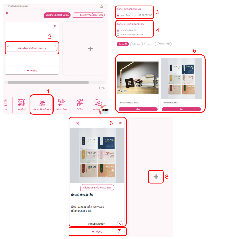 การตอบกลับแบบแค็ตตาล็อกสินค้า: (ลักษณะคล้ายเมนูลิสต์ แต่เป็นการดึงรูป, รายละเอียด, และปุ่มลิงก์ไปยังสินค้าโดยอัตโนมัติ สามารถเลือกแสดงได้จากบนร้านค้า Zwiz หรือ ร้านค้าบน LINE Shopping)