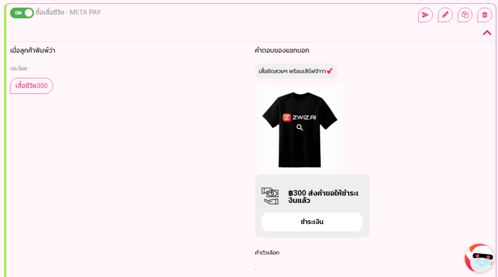 เมื่อลูกค้ากดปุ่มนี้ ผู้ใช้จะต้องไปตั้งค่าหน้า Conversation (บทสนทนา) ว่าจะให้บอทตอบกลับว่าอะไร