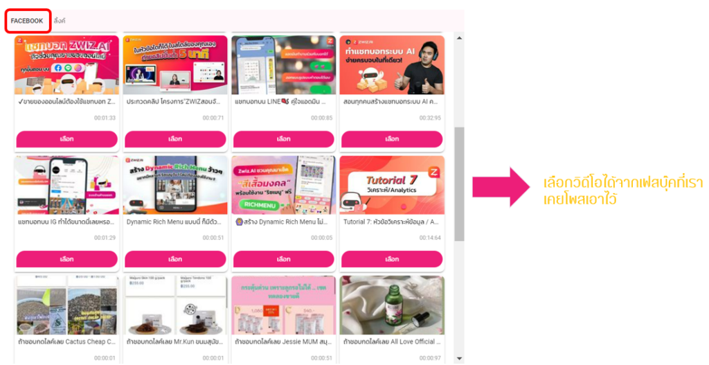 แบบที่ 1: Facebook (เลือกวิดีโอที่เคยโพสต์บนเฟซบุ๊คได้เลย)