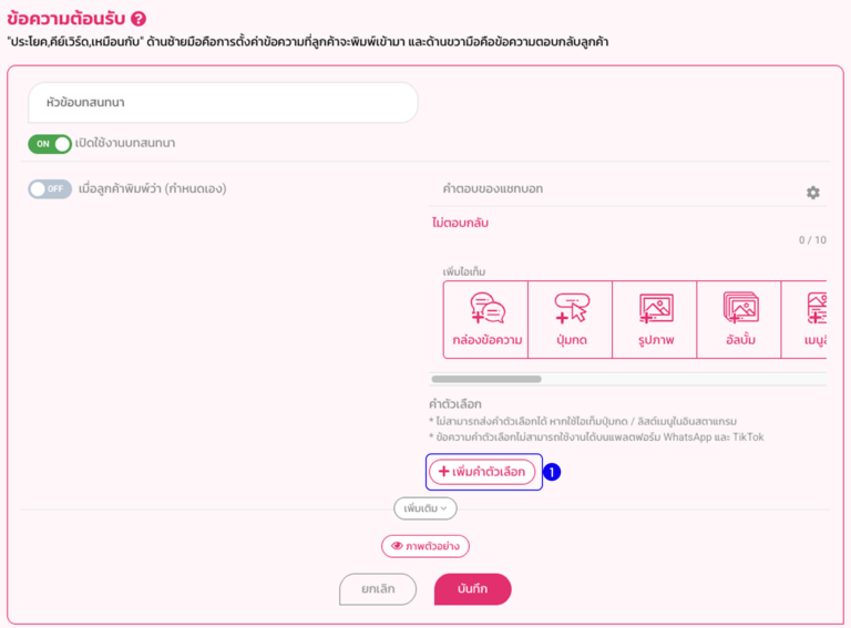 (เมื่อเพิ่มคำตัวเลือกเสร็จต้องไปตั้งค่าคำตอบไว้ที่หน้า “บทสนทนา” ด้วยนะคะ)