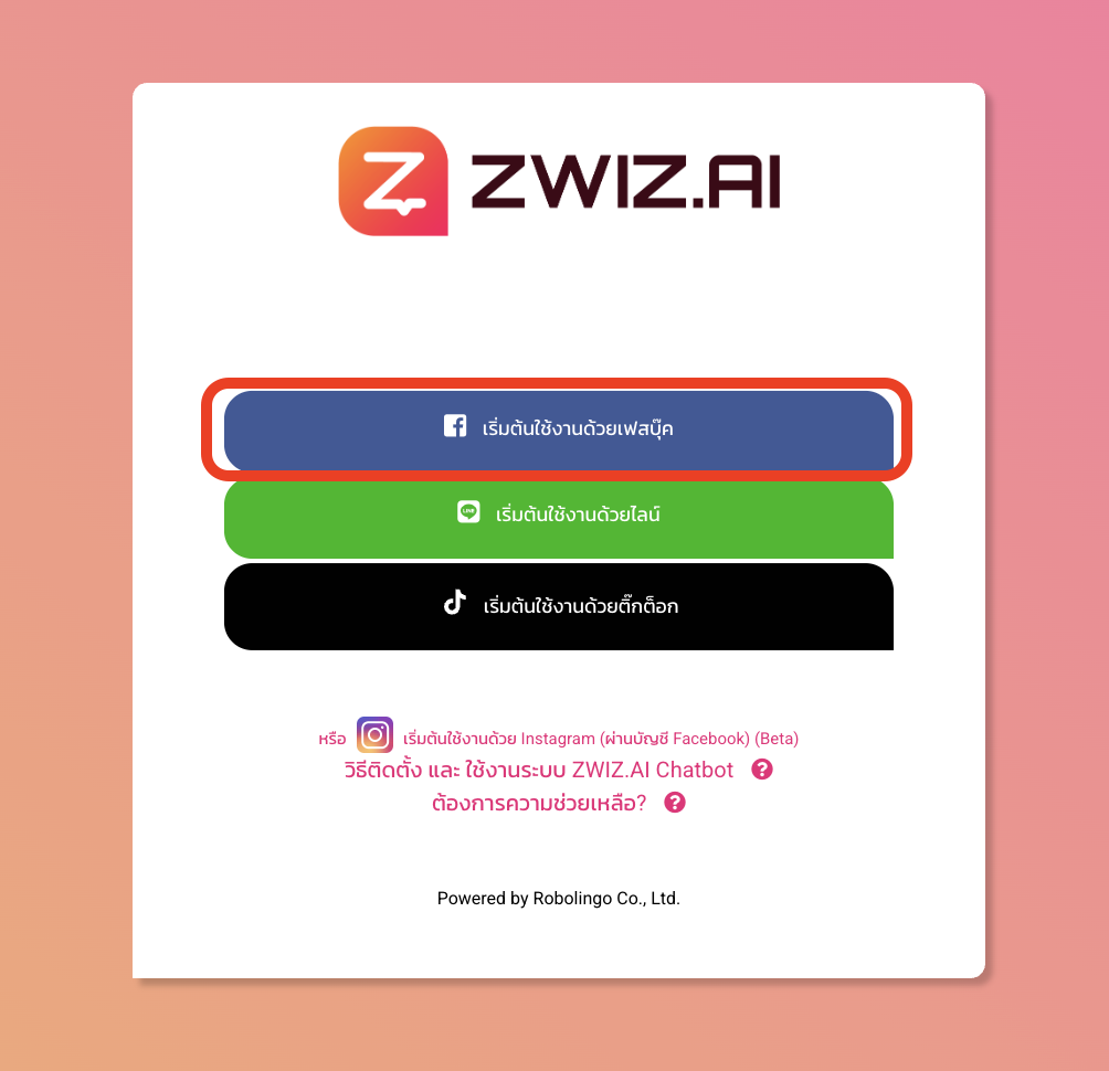 1. เข้าไปที่หน้าหลังบ้าน ZWIZ และกดเลือก “เริ่มการใช้งานด้วยเฟสบุ๊ค”