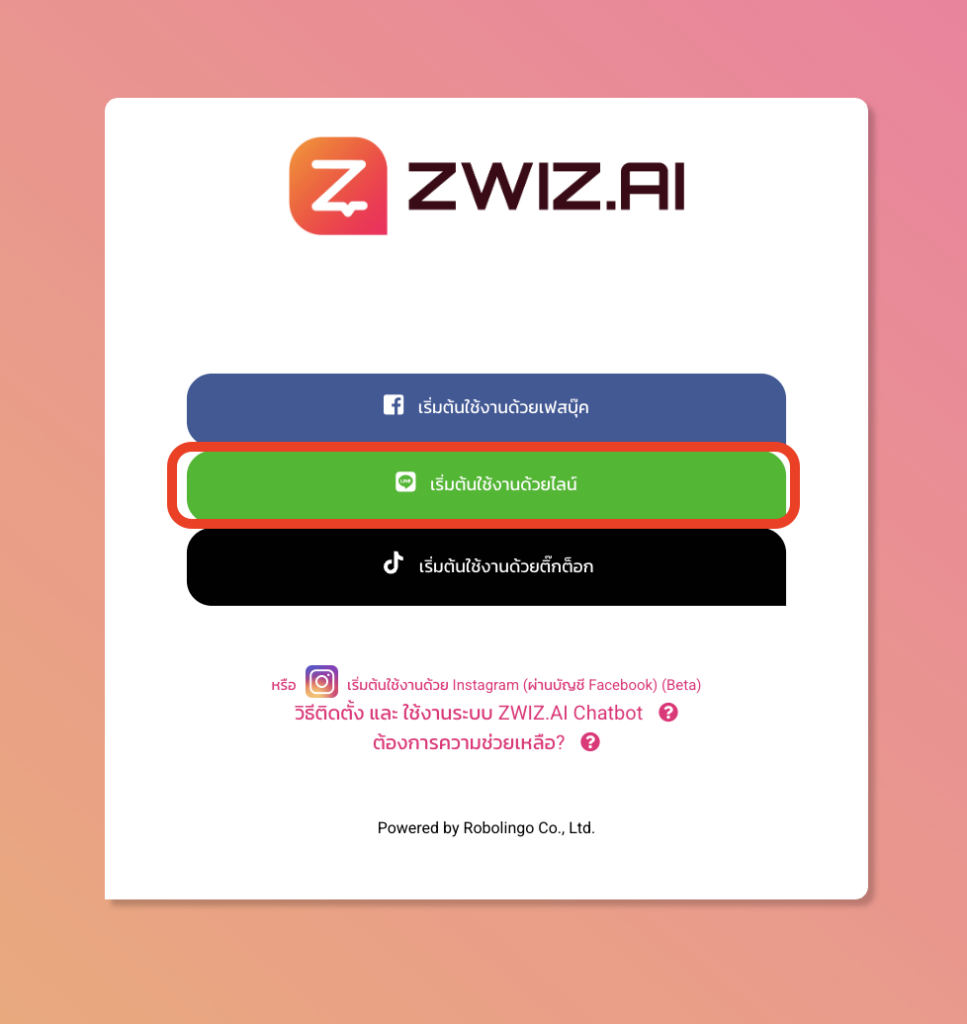1. เข้าไปที่หน้าหลังบ้าน ZWIZ และกดเลือก “เริ่มการใช้งานด้วยไลน์”