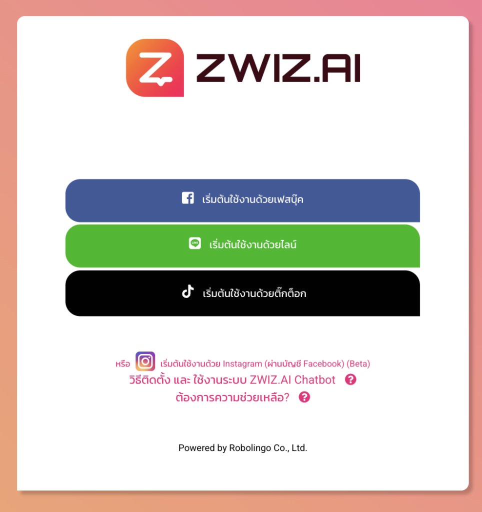 1. เข้าไปที่หน้าหลังบ้าน ZWIZ และกดเลือก “เริ่มการใช้งานด้วยเฟสบุ๊ค” หรือ “เริ่มการใช้งานด้วยไลน์” ได้เลย