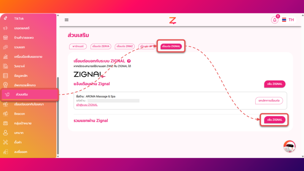 3. ไปที่เมนู “ส่วนเสริม” >> กดปุ่ม “เชื่อมต่อ ZIGNAL” >> เลื่อนลงมาในส่วนของ “รวมแชทผ่าน Zignal” >> จากนั้นกดปุ่ม “เพิ่ม ZIGNAL”