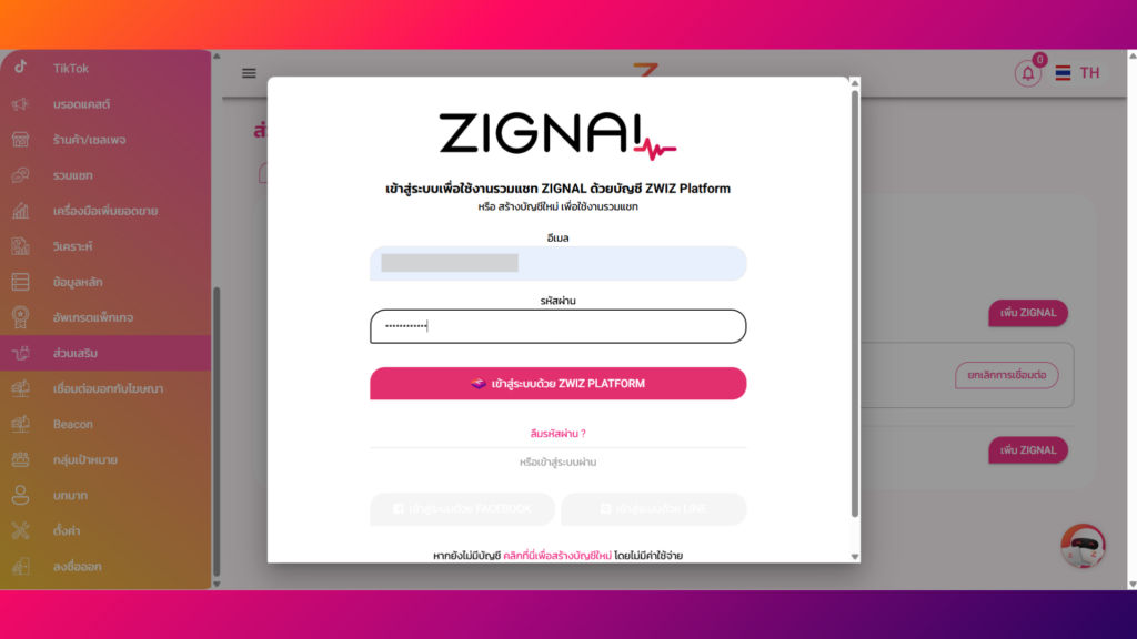 4. ระบบจะแสดงผลหน้าเข้าสู่ระบบ ZIGNAL ให้ระบุอีเมล และรหัสผ่านตามที่เคยเป็นสมาชิก (หรือหากยังไม่มีบัญชี ZIGNAL สามารถกดปุ่ม “คลิกที่นี่เพื่อสมัครสมาชิก” เพื่อสร้างบัญชี ZIGNAL ได้เลย