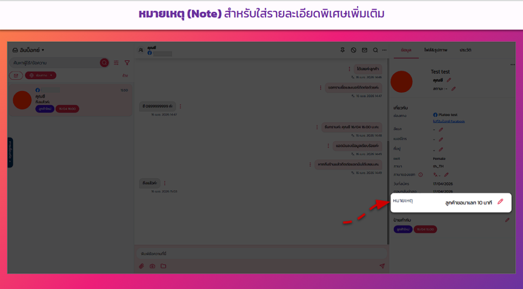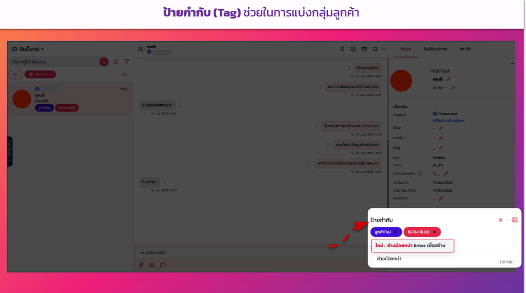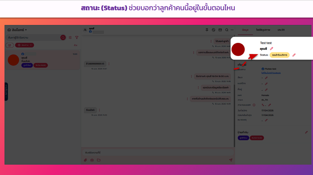 ช่วยให้ทีมรู้ว่าลูกค้าคนนี้อยู่ในขั้นตอนไหนแล้ว เช่น “รอดำเนินการ”, “กำลังรอของ” หรือ “ปิดการขายแล้ว” แอดมินคนอื่นมาดูต่อก็รู้ทันทีว่าต้องทำอะไรต่อ ไม่ต้องไล่อ่านแชทใหม่ทั้งหมด