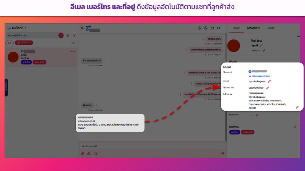 Super Tips💡 : ถ้าลูกค้าพิมพ์อีเมลหรือเบอร์โทรหรือที่อยู่ทิ้งไว้ในแชท ระบบ ZIGNAL จะตรวจจับและนำมาอัปเดตในช่องข้อมูลให้อัตโนมัติทันที! แอดมินไม่ต้องคอยก๊อปวางให้เสียเวลา