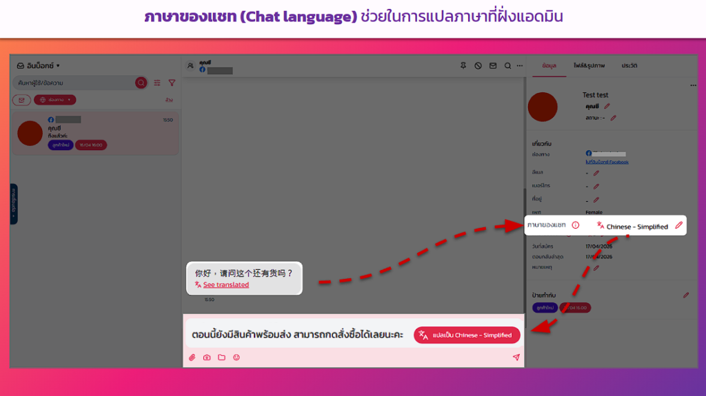 ระบบจะช่วยวิเคราะห์ภาษาที่ลูกค้าพิมพ์มา เพื่อใช้ในการช่วยแปลภาษาของแอดมินเป็นภาษาของลูกค้าได้ทันที ทำให้เราคุยกับลูกค้าต่างชาติได้อย่างมืออาชีพ หรือหากต้องการเปลี่ยนภาษาก็สามารถเปลี่ยนที่ ภาษาของแชท (Chat language) ได้เลย