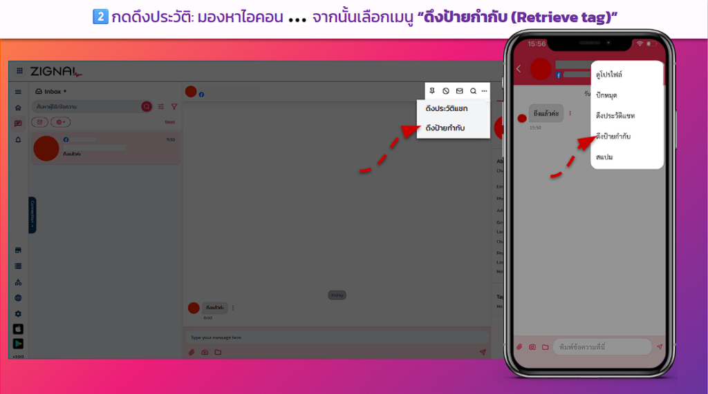 2.กดไอคอนจุดสามจุด (…) จากนั้นเลือกเมนู “ดึงประวัติป้ายกำกับ” (Retrieve Tag History)