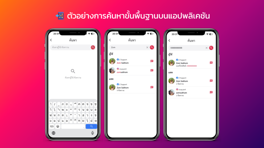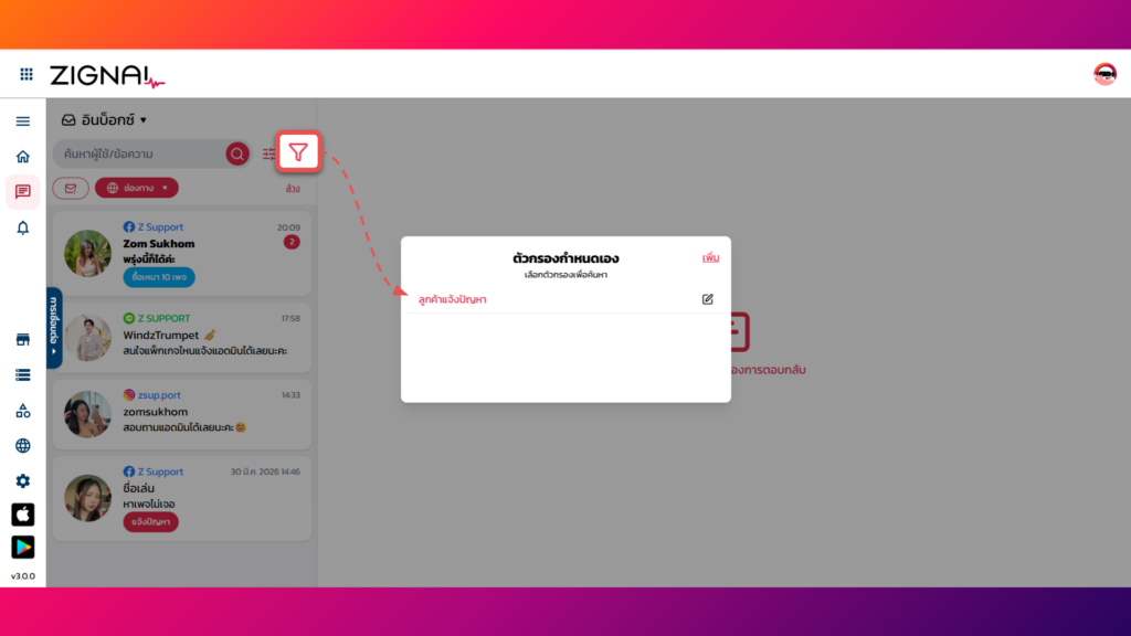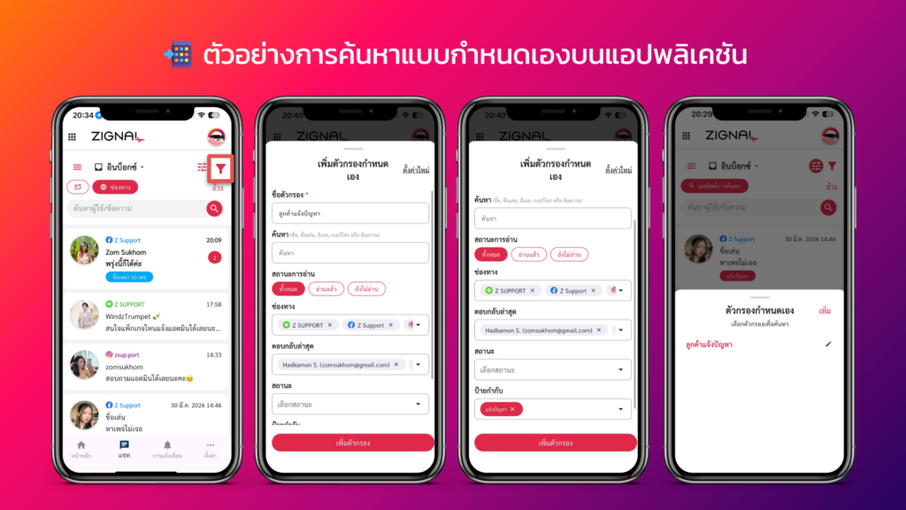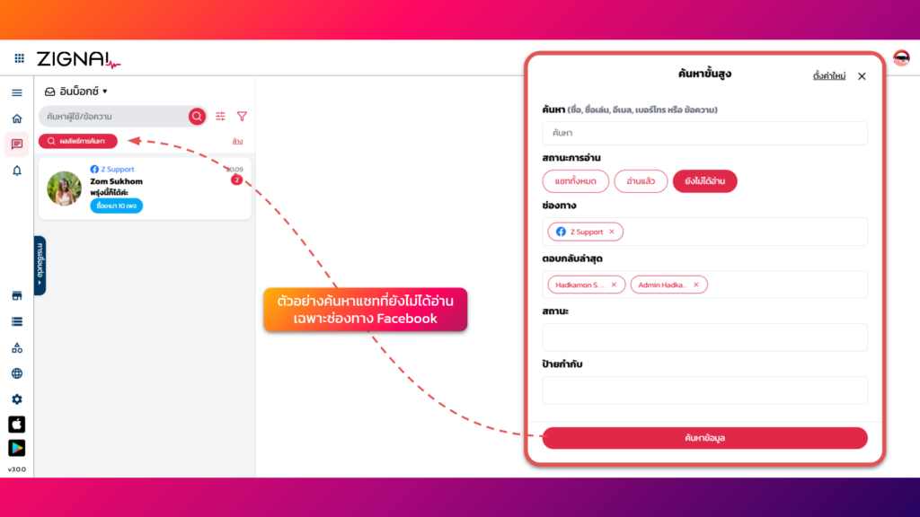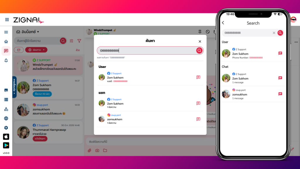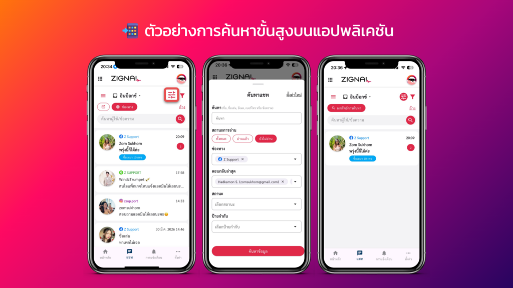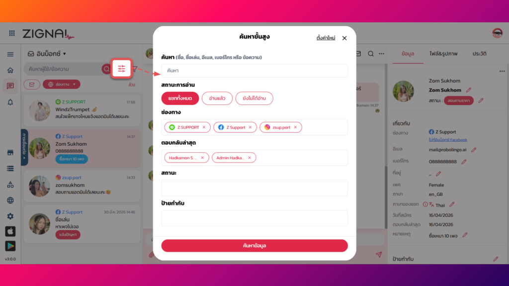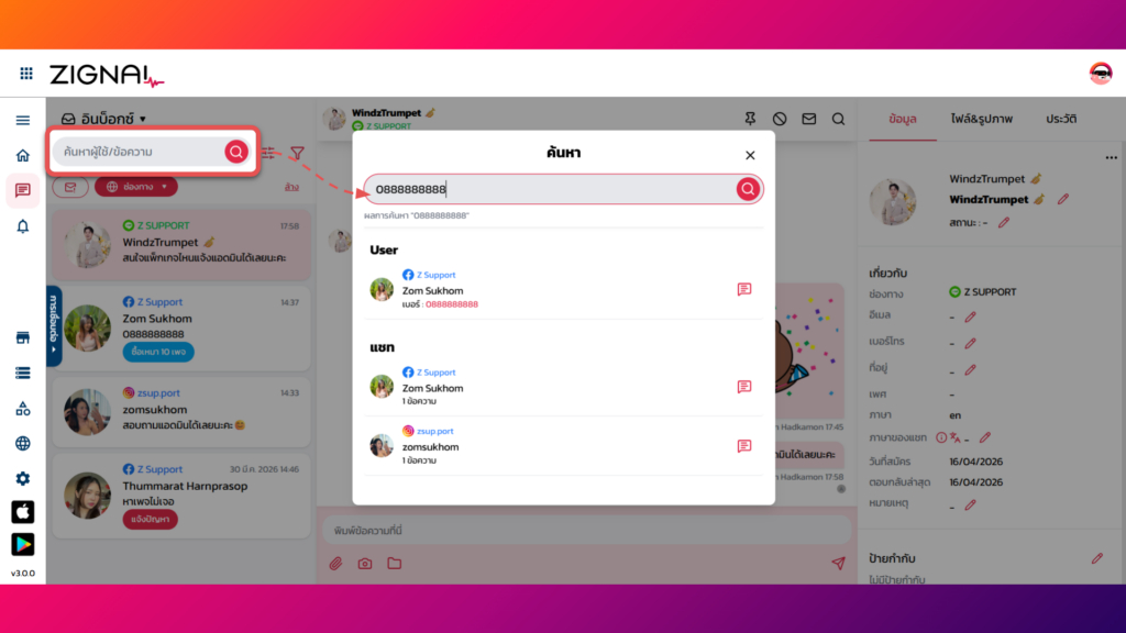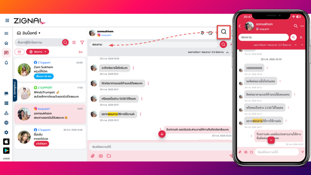 ฟีเจอร์ Search ใน ZIGNAL Chat ช่วยให้คุณค้นหาข้อมูลได้อย่างรวดเร็ว ทั้ง ข้อมูลลูกค้า และ ข้อความในแชท เพื่อให้การทำงานมีประสิทธิภาพและรวดเร็วมากขึ้น