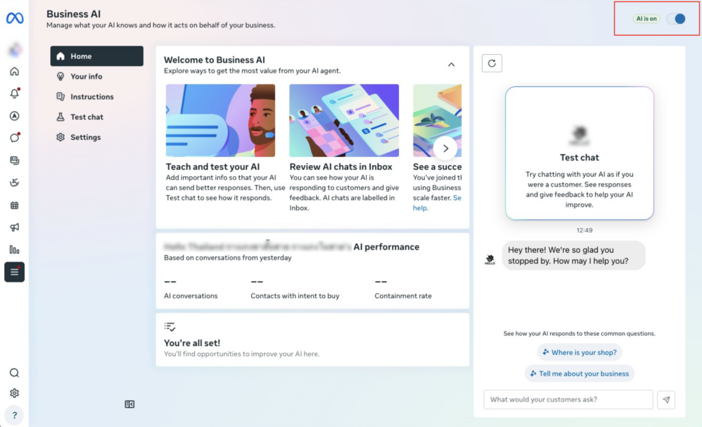 การตั้งค่าในรูปแบบนี้เป็น แนวทางชั่วคราว สำหรับช่วงที่ Meta Business AI ยังอยู่ในระยะ Beta Test เท่านั้น