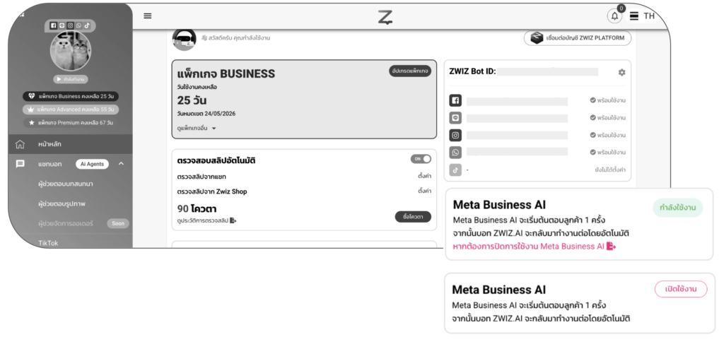 และแน่นอนว่า มีลูกค้าหลายรายของเราที่เริ่มสนใจอยากทดลองใช้งาน ZWIZ.AI แชทบอท ร่วมกับ Meta Business AI เพื่อให้สามารถใช้ประโยชน์จากทั้งสองระบบได้พร้อมกัน